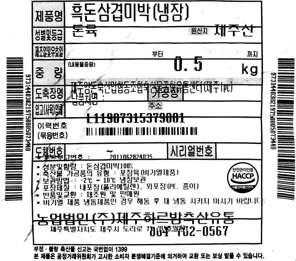 * 유통정보 제품명에 흑돈삼겹미박 이라고 되어 있어요.