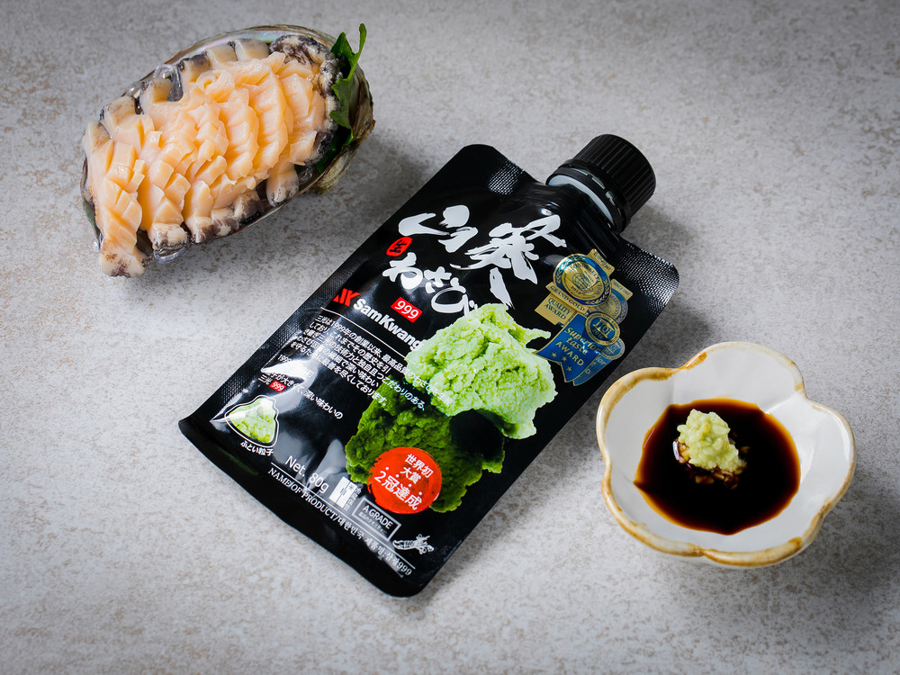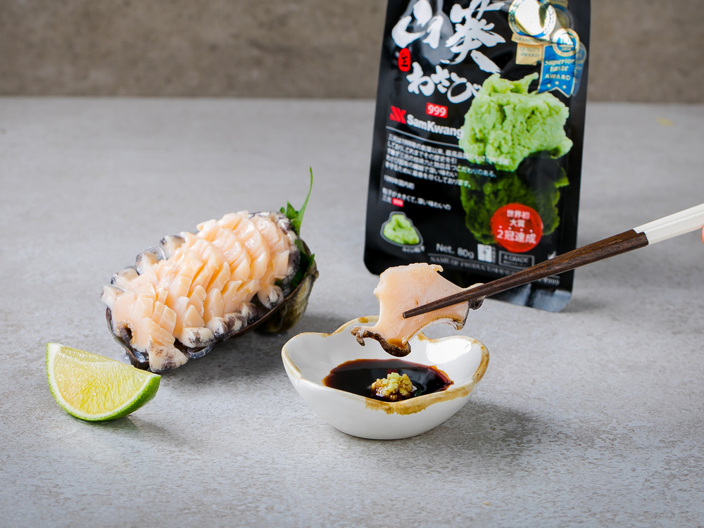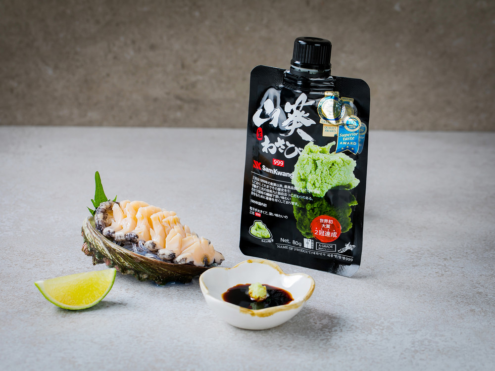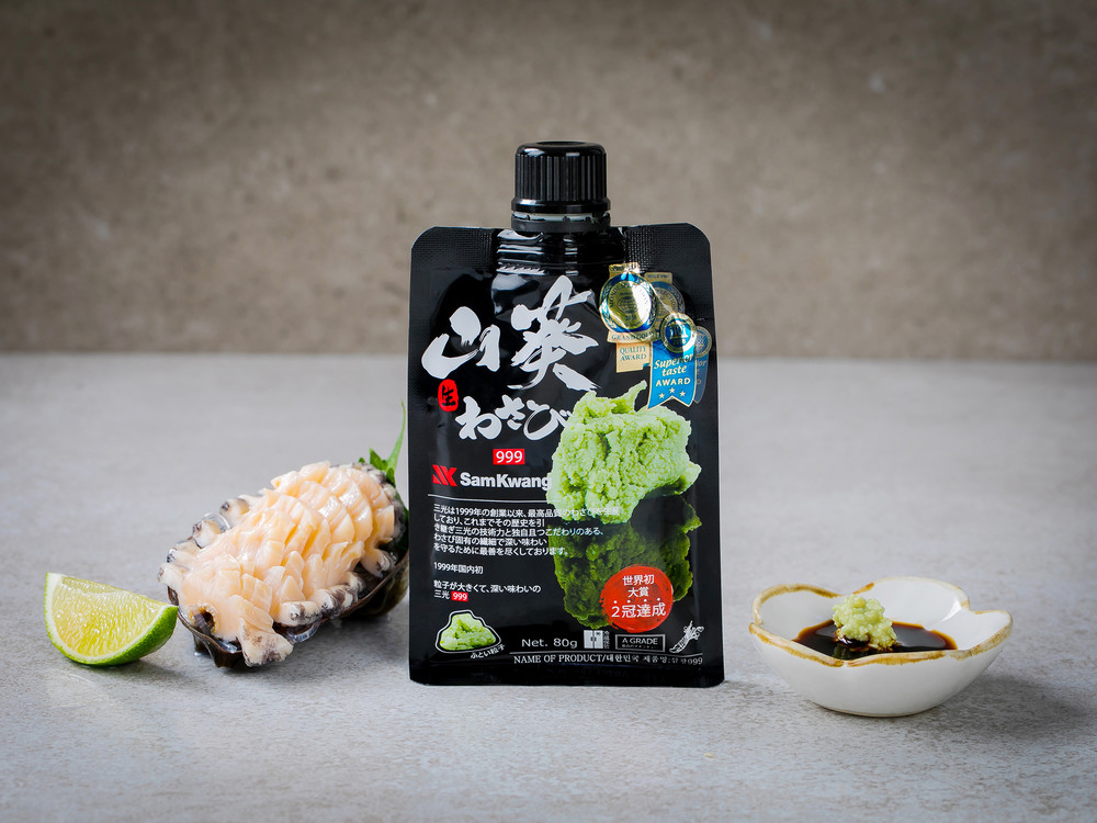 삼광999의 와사비는 입자는 섬세하지만 굵은 알갱이가 씹혀서 와사비를 전용 강판에 갈아먹는 느낌을 주는데요. 굵게 갈린 알갱이로 인해 입자감이나 청량감이 더 강하게 느껴지기도 할 뿐만 아니라 간장에 쉽게 풀린다는 장점도 있답니다. 세계적인 식품품평회인 프랑스의 몽드셀렉션, 벨기에의 iTQi(International Taste & Quality Institute, 국제 식품 품평회)에서 각각 대상을 차지한 대한민국 브랜드 삼광 와사비는 자연 그대로의 맛을 위하여 GMO원료를 사용하지 않고 있어요. 삼광의 기술력과 원료 숙성과 발효를 통해 나오는 독자적이고 감칠 맛 나는 매운 맛을 느껴보세요!