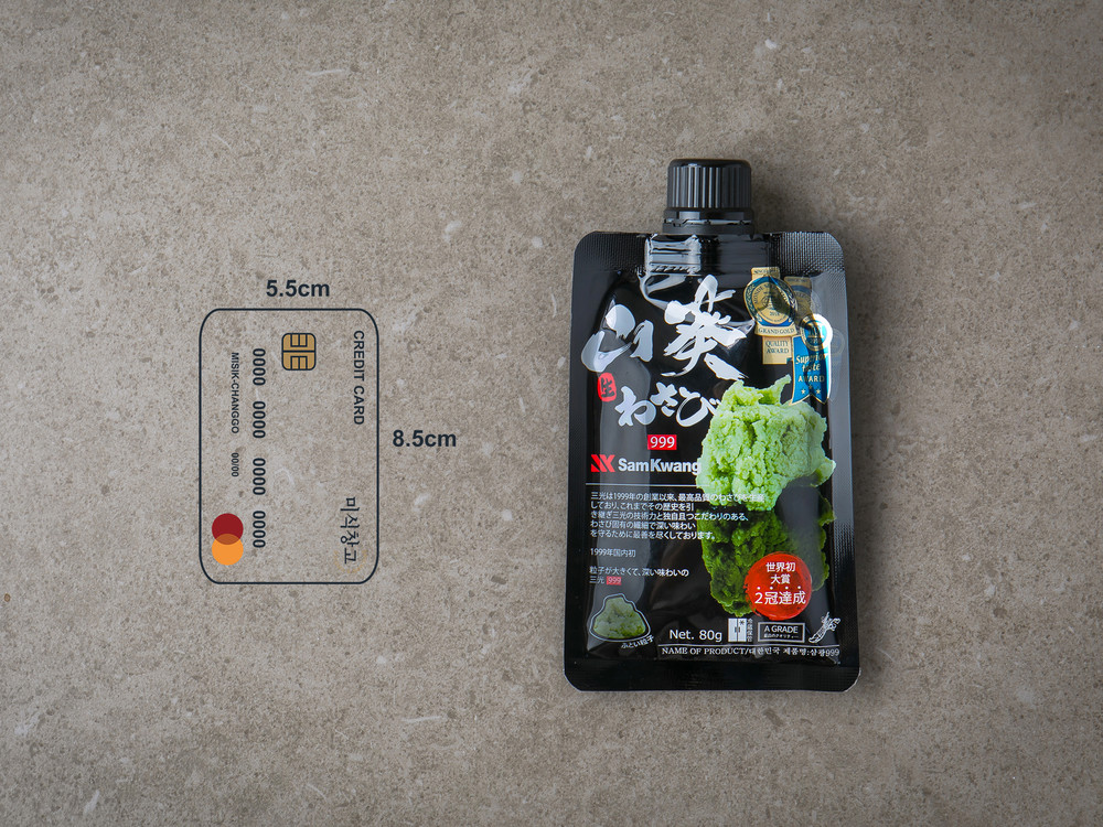 미식창고가 보내드리는 [삼광999] 와사비 80g 제품 용기입니다. 해당 제품의 사이즈가 궁금하시다면 가지고 계신 신용카드나 체크카드 기준으로 크기를 비교해보세요.