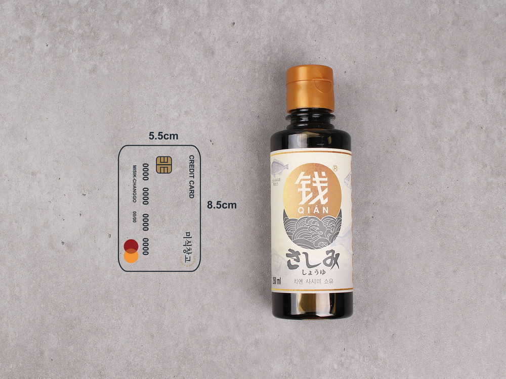미식창고가 보내드리는 [치엔] 회간장 250ml 제품 용기입니다. 해당 제품의 사이즈가 궁금하시다면 가지고 계신 신용카드나 체크카드 기준으로 크기를 비교해보세요.