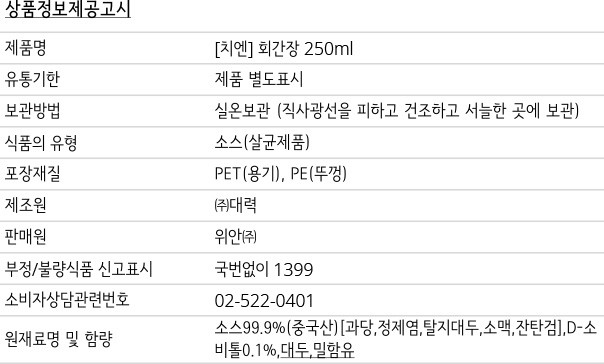 생선회에 최적화된 진득한 회간장을 찾고 계셨다면 주목해주세요. 20년 전통의 와사비 국내브랜드 삼광에서 만든 치엔 회간장을 준비했습니다. 삼나무 요람에서 콩을 농축, 발효, 숙성하여 만들어내 점도가 높아진만큼 생선회와의 밀착성이 좋아 입안 가득 진한 간장의 풍미가 퍼진답니다. 적절한 단 맛과 함께 미세한 산도가 회의 맛을 살려주고 비린 맛을 잡아주기도 하구요. 無MSG, 합성보존료, 합성착향료, 카라멜색소 없이 최고의 향기와 색상, 맛을 보여줍니다. 회 전용 간장으로 깊으면서도 적당한 짭조름함, 그리고 기분 좋은 단 맛이 있어 담백한 회나 해산물을 찍어먹으면 감칠 맛이 더해질거예요!