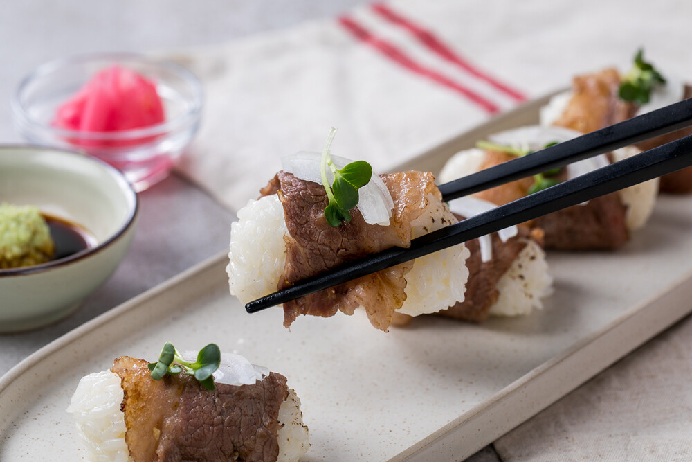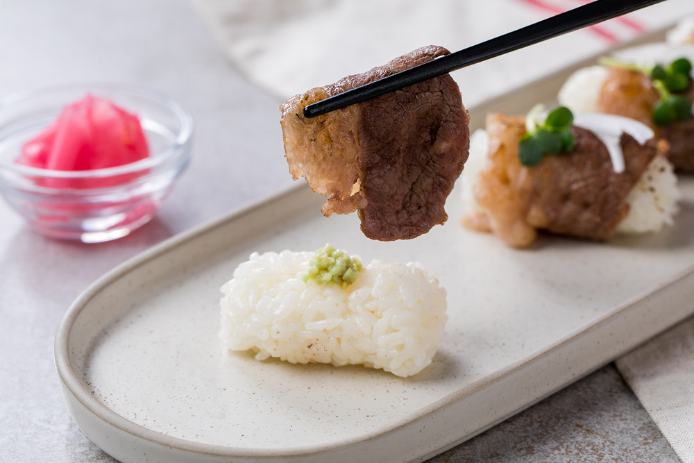 3. 구운 차돌로 초밥을 감싼 뒤, 무순이나 양파 등으로 데코레이션 해주면 더 먹음직스러워 보일거예요!