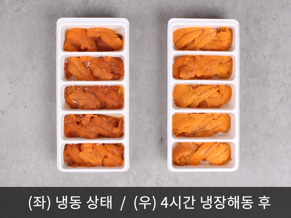 * 주의 사항 : 냉장/냉동 상품 동시 주문시 최대한 이격시켜 개별 분리포장으로 최선을 다하고 있으나, 동절기 영하 날씨 또는 냉동상품 냉기에 의해 간혹 냉장성게알 겉표면이 살짝 얼어서 배송될 수 있습니다. 이런 경우 냉장고에 보관해주시면 다시 본래대로 돌아오며 드시는데는 전혀 이상이 없으나, 우려되실 경우 개별 주문해주시거나 톡상담으로 문의해주시길 바랍니다.