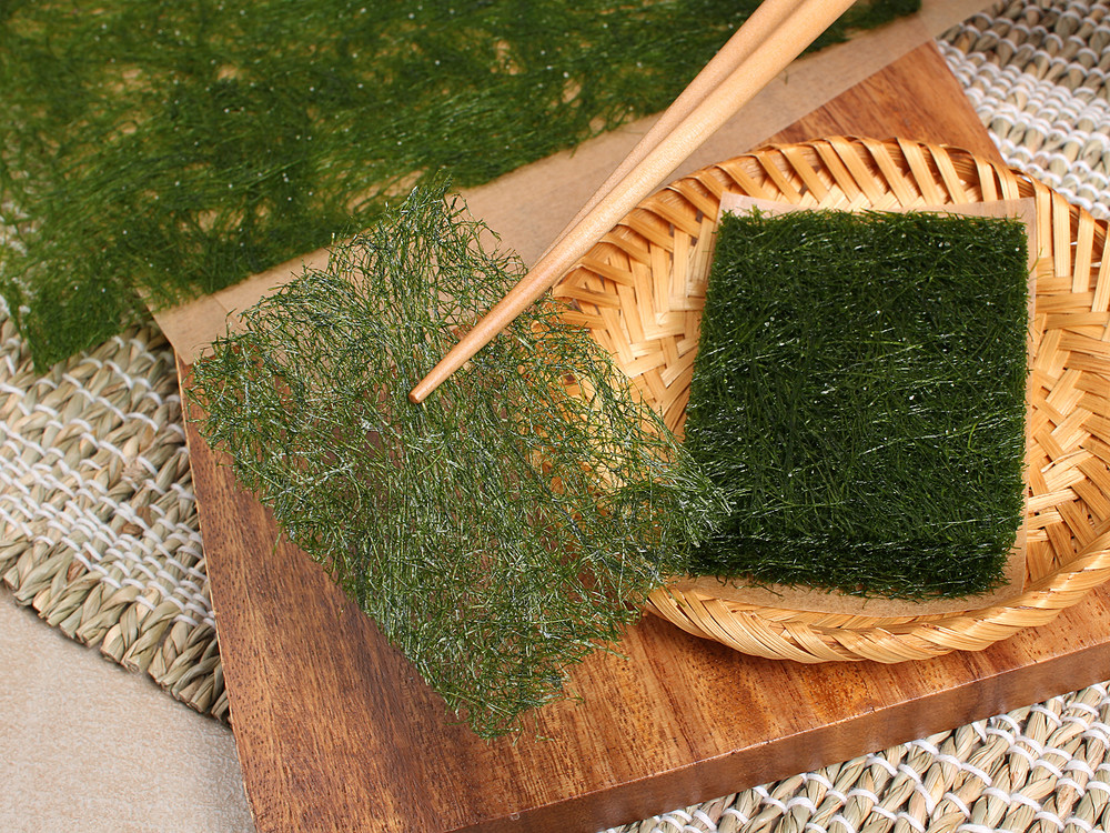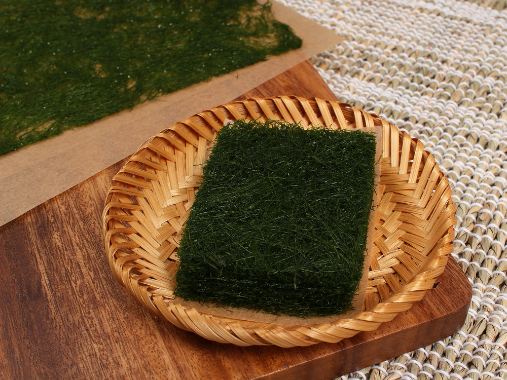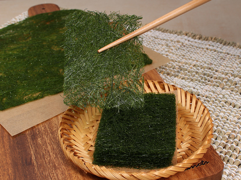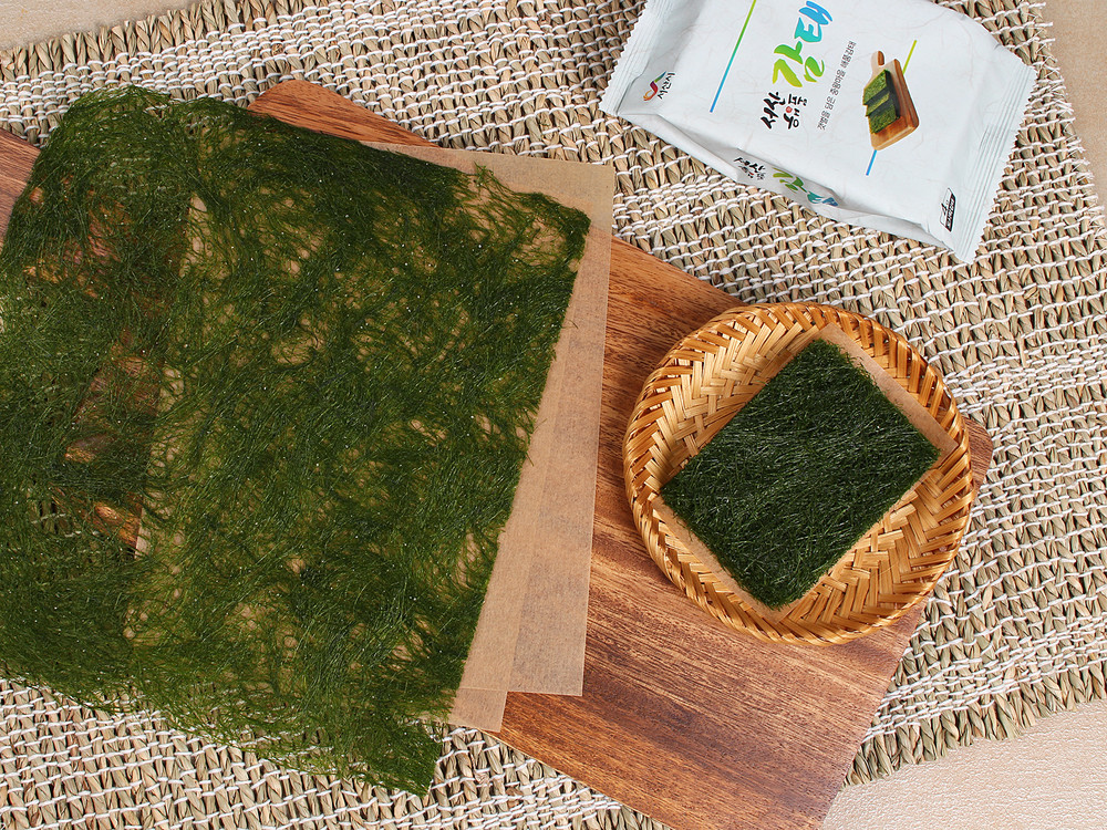· 실처럼 가늘고 밝은 초록빛의 감태에 참기름과 소금으로 최소한의 조미만 하여 구웠다.