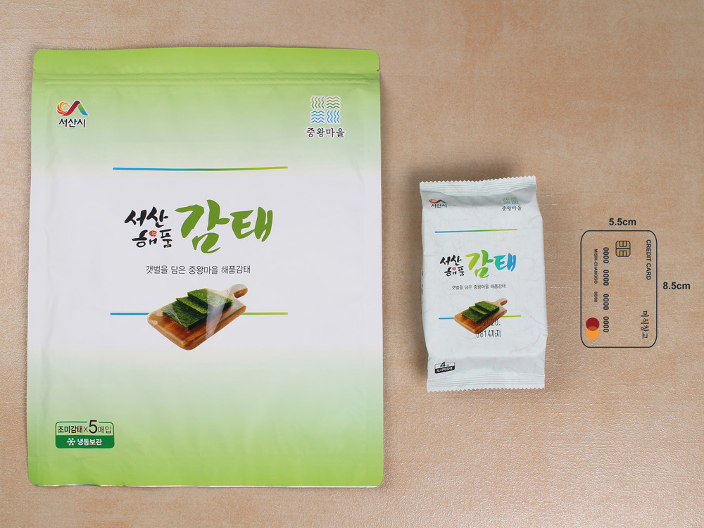 미식창고에서 보내드리는 생 감태는 먹기 편하게 잘라져 있는 도시락형으로 준비되어 있고, 조미 감태는 도시락형과 전장형 두 가지 타입이 준비되어 있습니다. 가지고 계신 신용카드나 체크카드 기준으로 크기를 비교해보세요.