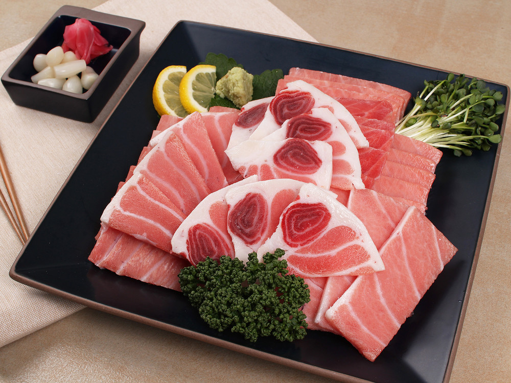 참치의 종류는 참다랑어, 눈다랑어, 황다랑어, 황새치, 가다랑어 등으로 나뉩니다. 그 중 참치 서열 1위! 가장 최고급 참다랑어 참치회를 소개해드립니다. 참치는 클수록 맛있다는 철칙에 따라 50상 이상의 자연산 참다랑어를 (50상 참다랑어의 경우 원어의 실제 무게는 250kg 정도) 양식장에 일정기간 가두리 양식하여 지방을 키워 마블링이 좋고 기름기가 뛰어난 축양 참다랑어의 뱃살을 취급합니다. 참치는 가마(아가미) 쪽으로 맛있다는 원칙에 따라 가마 쪽에 가장 가까운 부위를 1번 뱃살이라 부르고 그 옆의 뱃살을 2번 뱃살 이라고 부르는데요. 2번 뱃살 중에서도 가장 앞단 부위, 앞뱃살은 특히 진하고 고소한 맛이 좋으며 이 부분에 배꼽살도 포함되어 있답니다. 그래서 '2번 앞뱃살' 부위는 보다 가성비좋게 1번 뱃살과 흡사한 가장 고급진 맛을 즐길 수 있다는 점이 포인트라 할 수 있어요!
