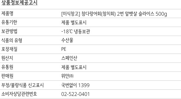 · 참다랑어회(참치회)는 급냉시킨 제품으로 수령 후 즉시 그대로 냉동보관 하시고 가급적 당일 섭취 또는 3일 이내에 섭취 바랍니다. 드시기 전에 냉장실에서 2~3시간 저온숙성 해동한 후 드시는 것을 권장해드립니다.