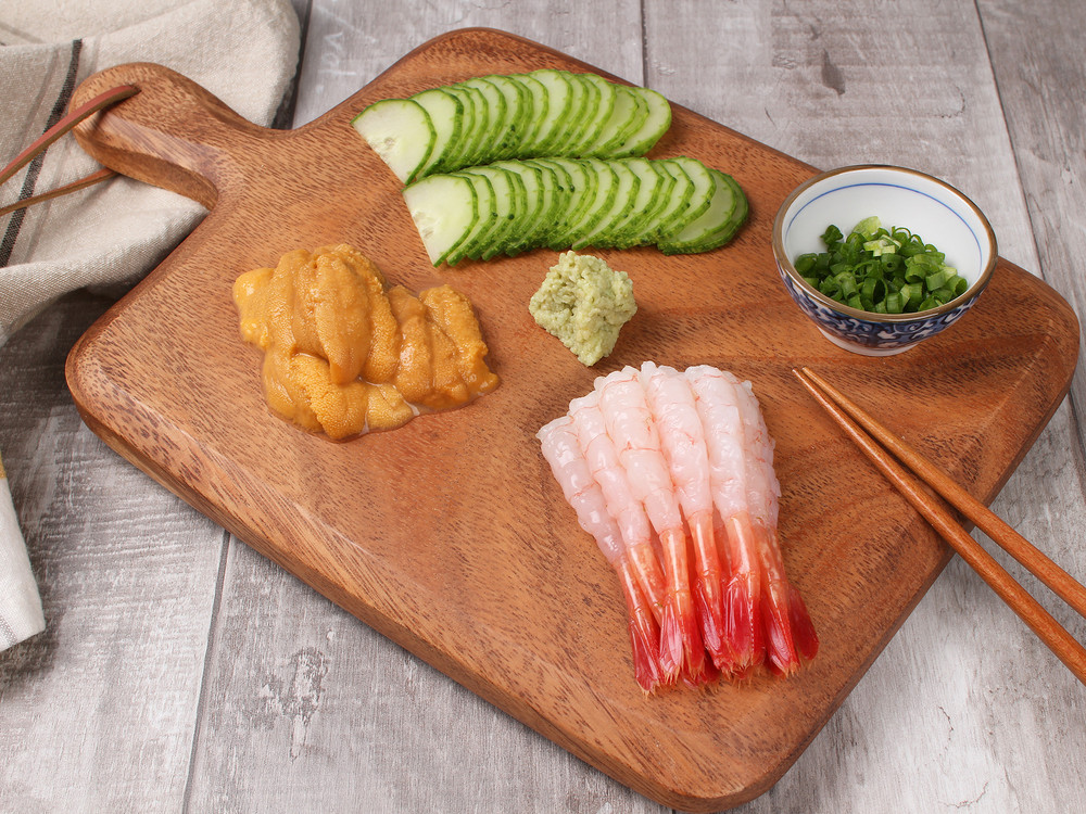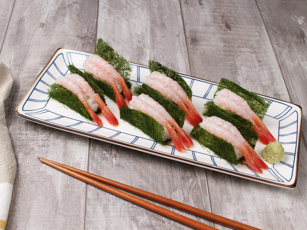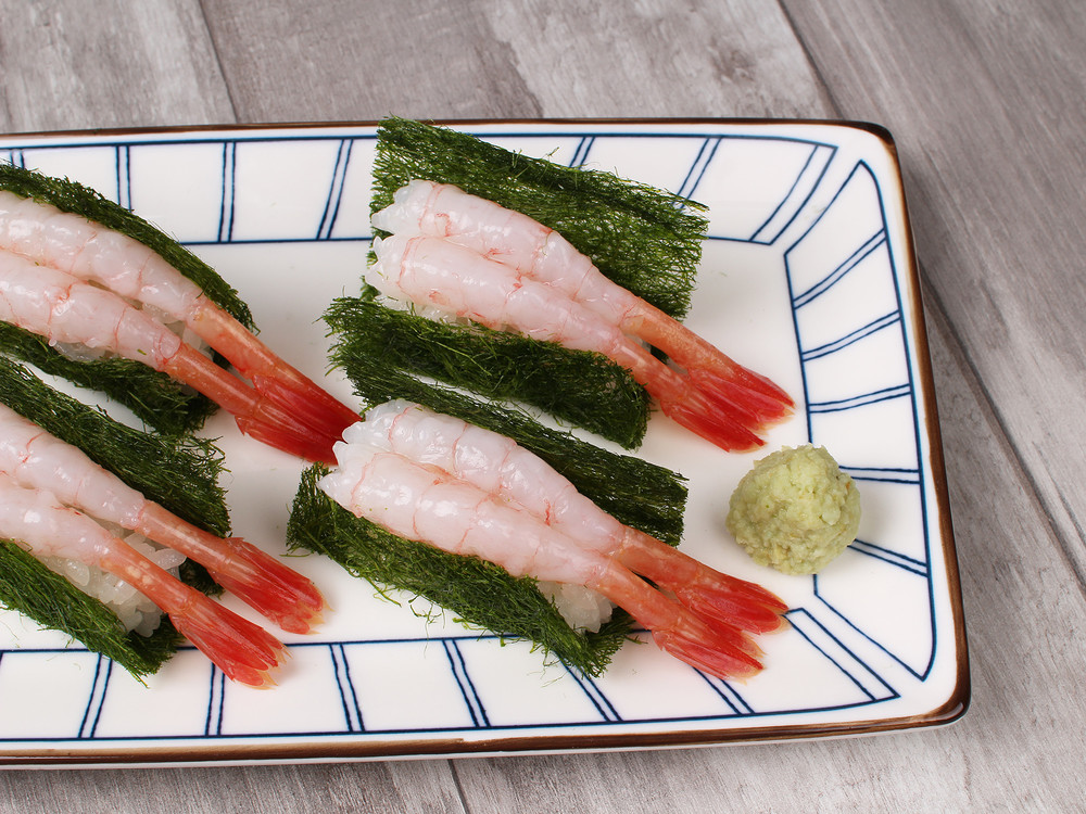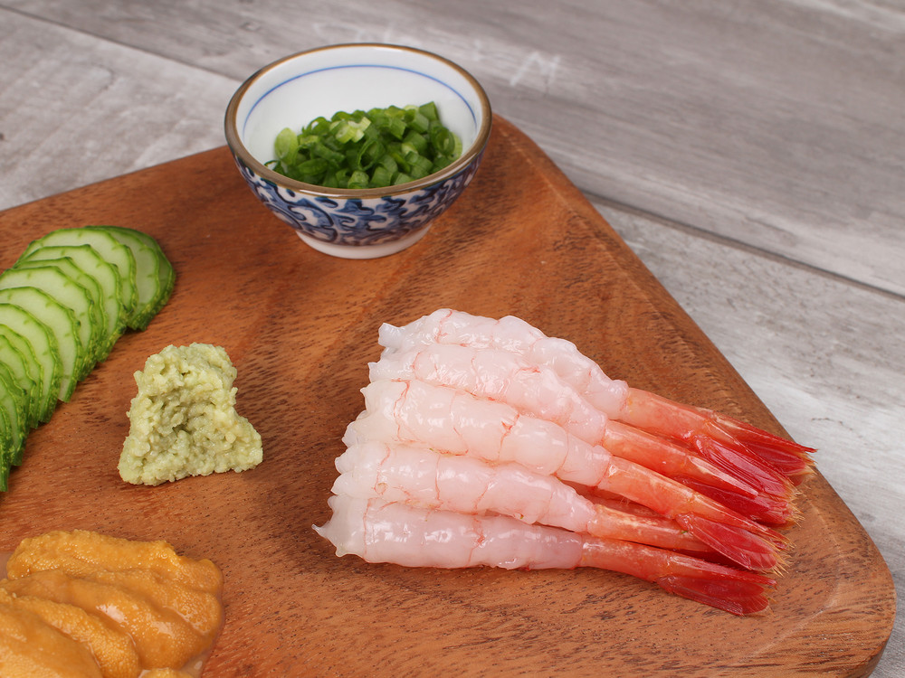 *생와사비와 간장만 곁들여 회로 드셔도 단새우 자체의 달달함을 맛볼 수 있습니다. 특히 달큰하고 점도가 높아 해산물과의 밀착성이 높은 *치엔 회간장에 찍어드시면 더욱 맛있습니다! 그리고 *좋은 쌀로 만든 초밥을 이용하여 '밥-생와사비-단새우' 순으로 얹으면 스시전문점에서 먹던 그 단새우초밥이 완성되지요.