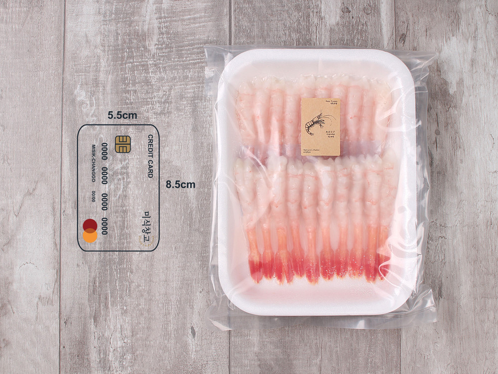 미식창고에서 보내드리는 달달한 단새우(아마에비)는 손질된 20마리의 단새우를 담아 전달해드립니다. 가지고 계신 신용카드나 체크카드 기준으로 크기를 비교해보세요. 중량을 기준으로 포장을 하여 크기는 약간씩 다를 수 있지만 최대한 일정한 단새우를 보내드리도록 하겠습니다. 단새우는 급냉시킨 제품으로 수령 후 즉시 그대로 냉동보관 하시기 바랍니다. 드시기 전에 꺼내어 냉장실에서 냉장 해동 또는 위 해동법대로 해동한 후 드시는 것을 권장해드립니다.