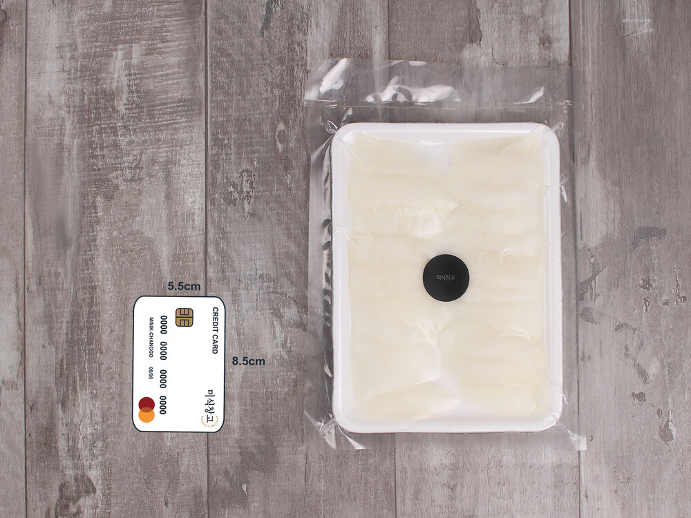 미식창고에서 보내드리는 손질 갑오징어회(회초밥용) 은 120g 중량으로 손질된 갑오징어회 20미를 담아 전달해드립니다. 가지고 계신 신용카드나 체크카드 기준으로 크기를 비교해보세요. 중량을 기준으로 포장을 하여 크기는 약간씩 다를 수 있지만 최대한 일정한 상품으로 보내드리도록 하겠습니다. 갑오징어회는 손질 후 바로 급냉시킨 제품으로 수령 후 즉시 그대로 냉동보관 하시기 바랍니다. 드시기 전에 꺼내어 냉장실에서 냉장 해동 또는 위 해동법대로 해동한 후 드시는 것을 권장해드립니다.