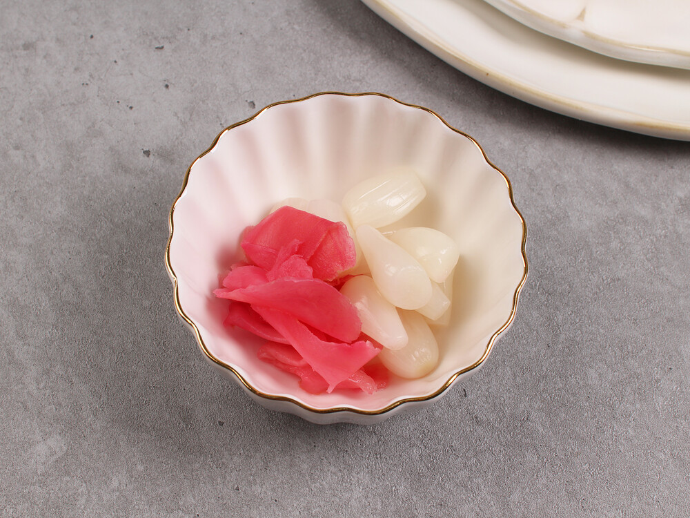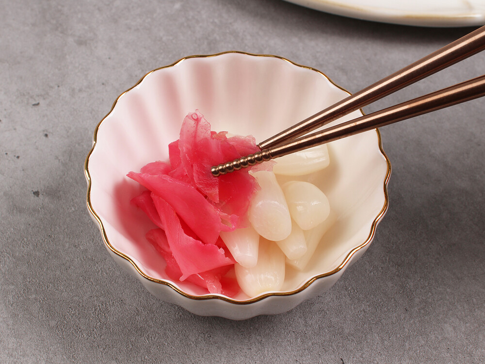 '초생강'은 식초에 절인 생강으로 시원한 생강 향과 새콤달콤한 맛이 특징이예요. 해산물을 먹을 때 간혹 느껴지는 바다 내음을 깔끔하게 잡아주는 역할도 해서 더욱 다채로운 식사를 도와주기도 한답니다. 특히 붉은 색감의 '적초' 생강은 눈으로 먹는 즐거움까지 더해줄거예요!