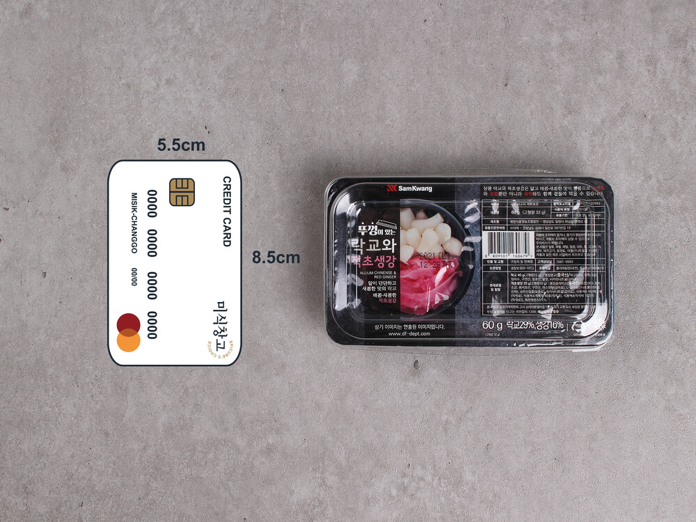뚜껑이 있는 락교와 적초생강 제품은 60g 상품 입니다. 해당 제품의 사이즈가 궁금하시다면 가지고 계신 신용카드나 체크카드 기준으로 크기를 비교해보세요. 미식창고는 제품 선별부터 배송까지, 꼼꼼하게 포장하여 최상의 상태로 깔끔하고 신선하게 전해드립니다.