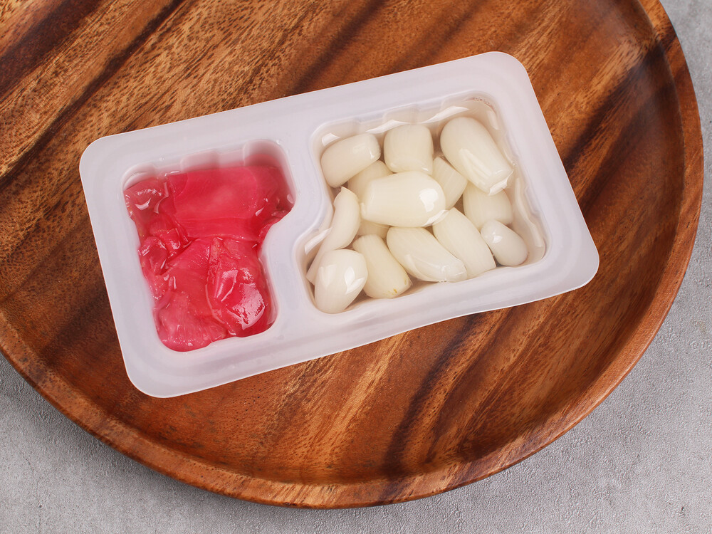 락교와 초생강은 회나 초밥을 먹을 때 많이 찾는 곁들임 중 하나로, 새콤달콤한 감칠 맛과 개운한 청량함을 담당하는데요! 특히 하얗고 붉은 예쁜 색감이 플레이팅을 완성해주기도 해서 해산물 상차림 한 켠에 자리잡기도 한답니다. 참다랑어회를 먹다가 기름지게 느껴질 때 또는 초밥을 먹다가 심심하게 느껴질 때도 락교나 초생강을 먹으면 은은한 매운 맛이 입안을 싹 정리해주지요. 미식창고에서는 아삭한 락교와 개운한 초생강을 부담없이 드실 수 있도록 1인 양으로 포장한 혼합 곁들임 키트를 소개해드려요. 남김없이 한 번에 드실 수 있는 양이지만, 혹시 남게 되더라도 간편하게 보관하실 수 있도록 뚜껑까지 있는 실속 패키지이오니 편하게 만나보세요!