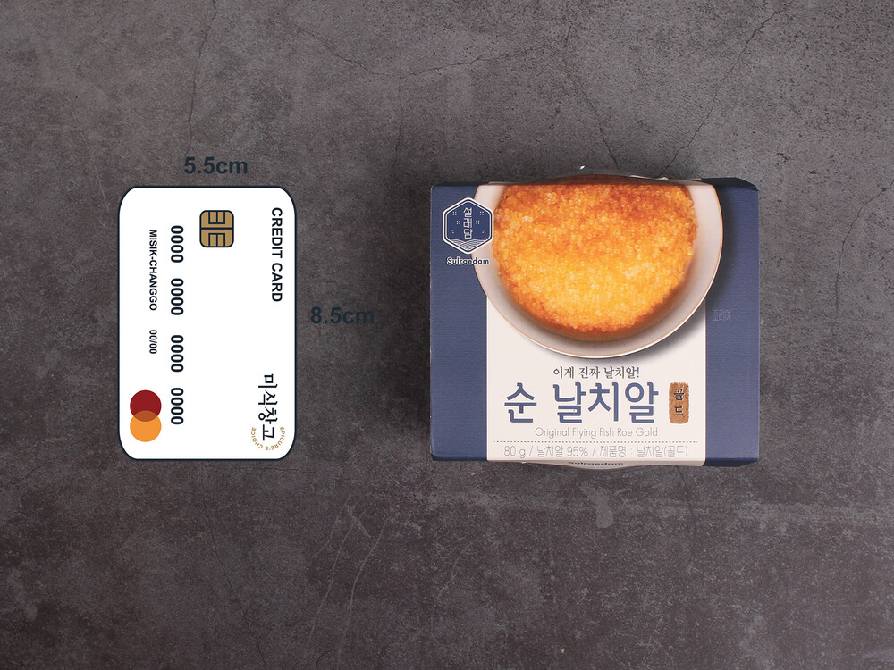 미식창고에서 보내드리는 순 날치알(골드)는 80g의 중량 패키지로 전달됩니다. 가지고 계신 신용카드나 체크카드 기준으로 크기를 비교해보세요. 급냉시킨 제품으로 수령 후 즉시 그대로 -18℃ 이하 냉동보관 하시기 바랍니다. 냉동상태의 제품을 드시기 1~2시간 전에 미리 꺼내어 5℃ 이하의 냉장실에서 냉장 해동 후 드시는 것을 권장해드립니다. 해동 후 재냉동시 변질의 위험이 있으므로 가급적 해동 및 개봉 후 당일내 섭취하시길 바랍니다. (포장 패키지는 제조사측 사정에 따라 변경될 수 있습니다)