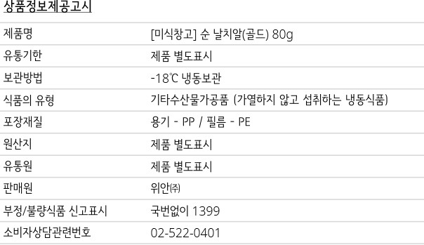 오리지널(순) 날치알의 색상은 노란 골드빛 이란 사실 알고 계세요? 빨간색과 초록색의 날치알은 화려한 색감을 주기 위해 색소가 가미된 것이지요. 저희 미식창고에서는 색소 없이 순수한 95%의 날치알과 레몬식초와 천일염, 설탕 등으로 가공한 '골드 날치알'을 소개해드려요. 날치알은 바다향 가득 알알이 톡톡 터지는 식감과 감칠 맛으로 요리의 활용도가 참 좋은데요. 짭쪼롬하고 담백한 맛으로 계란찜, 유부초밥, 알밥, 비빔밥 등 어떤 요리에나 존재감 있는 곁들임으로 제 역할을 톡.톡.히 한답니다. 가끔 입맛이 없을 때 조미되지 않은 고소한 김에 흰 쌀밥과 날치알만 넣고 싸드셔도 참 맛있어요! 혼자서도 부담없이 드실 수 있게 80g 으로 소량포장하여 전달해드리니 집에서도 간편하게 즐겨보세요.