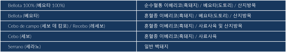 보통 하몽에 이베리코라고 쓰여 있으면 좋은 하몽이라고 알고 계셨나요? 반은 맞고 반은 틀린 얘기입니다. '이베리코'는 흑돼지를 뜻하는 말인데, 먹고 자란 '사료'와 '혈통'에 따라서 하몽의 등급이 나뉘기 때문입니다. 도토리를 먹고 자랐는지 일반사료를 먹고 자랐는지, 방목으로 키워졌는지 사육되었는지, 순수혈통인지 혼혈종인지에 따라서 하몽의 등급이 세분화되는 것이죠. 그 중 제일 높은 등급이 BELLOTA (베요타) 100% 랍니다! 스페인어로 '베요타'는 도토리를 뜻합니다. 몬태네라로 알려진 도토리의 계절(9월~2월) 동안 이베리코(흑돼지)는 도토리 등 을 먹으며 몸무게가 두 배로 늘어나게 되는데요. 몸무게가 200파운드에서 400파운드까지 늘어난다고 합니다. 100% 이베리코 베요타 는 스페인에서 지정된 Dehasa(데헤사) 초원지대에서 도토리를 먹고 방목되어 자란 '순수혈통' 흑돼지를 뜻하는 것이죠.