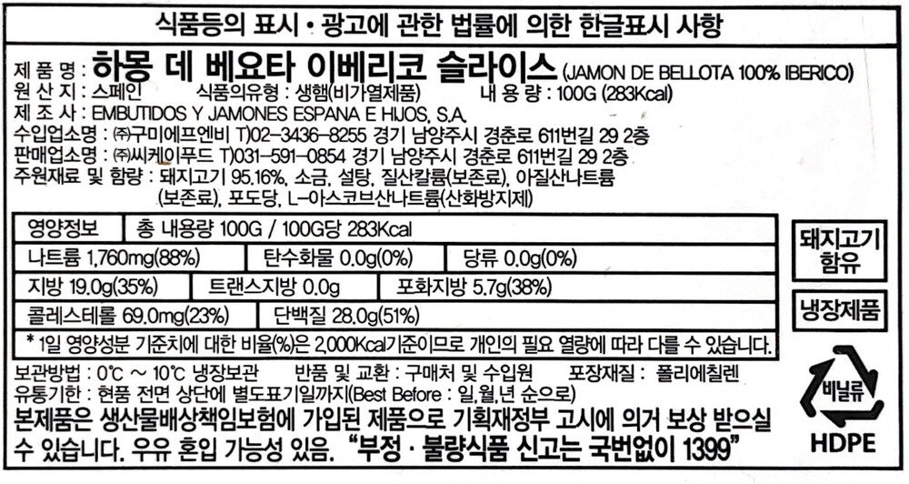 최상등급의 하몽, 이베리코 '베요타 100%'는 단독으로 드셔도 적당하게 짭조롬한 맛과 감칠맛이 돌아 맛있습니다. 숙성된 천일염의 단맛이 와인이나 맥주와의 궁합을 최고로 끌어올리기도 해요. 물컹한 식감의 저가 프로슈토나 세라노 하몽과는 비교불가! 촉촉한 BELLOTA 100%는 숙성기간이 긴만큼 훨씬 깊은 맛이 느껴지니 단독 안주로도 훌륭하다고 할 수 있어요.