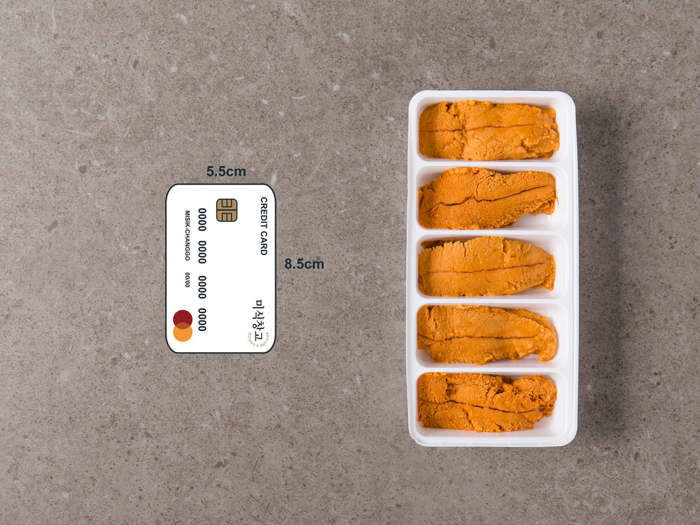 미식창고에서 보내드리는 캐나다 최상급 냉장성게알은 A급 상품으로 선별하여 100g씩 전용 케이스에 담아 보내드립니다. 가지고 계신 신용카드나 체크카드 기준으로 크기를 비교해보세요. 현지 생산에 따라 크기는 약간씩 다를 수 있지만 최대한 일정한 냉장성게알을 보내드리도록 하겠습니다.