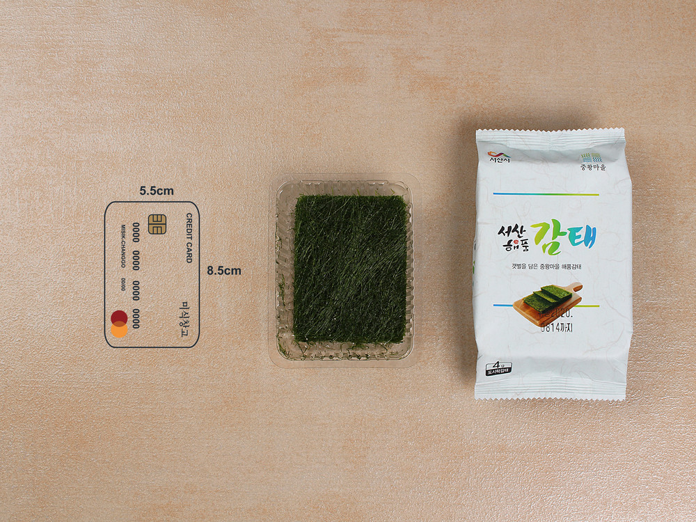 미식창고에서 보내드리는 생 감태는 먹기 편하게 잘라져 있는 도시락형으로 준비되어 있고, 조미 감태는 도시락형과 전장형 두 가지 타입이 준비되어 있습니다. 가지고 계신 신용카드나 체크카드 기준으로 크기를 비교해보세요.
