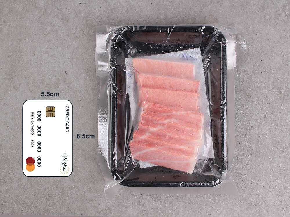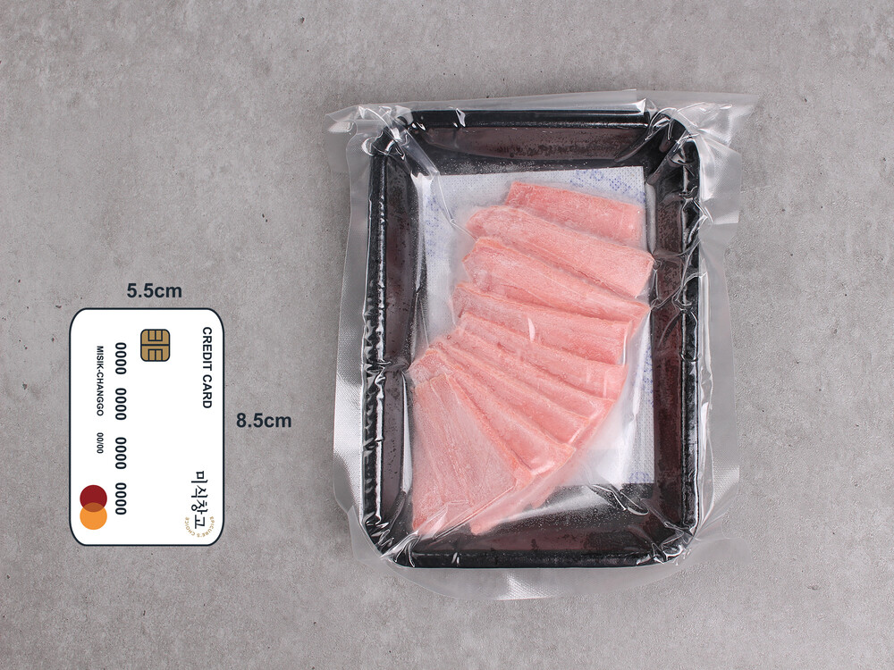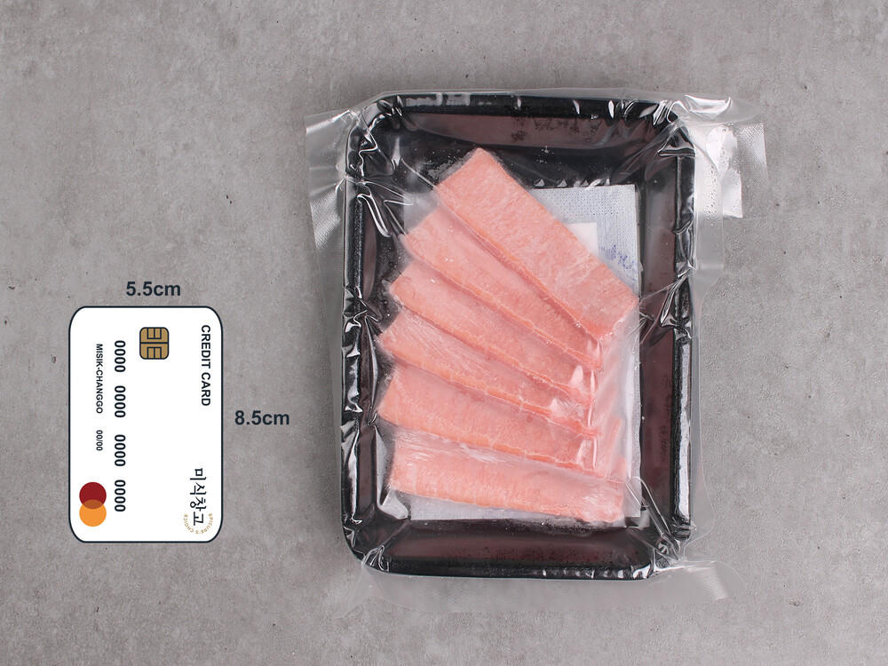 · 미식창고에서 보내드리는 참다랑어회(참치회) 부위별 상품은 슬라이스되어 접시 채로 진공포장되어 있습니다. 가지고 계신 신용카드나 체크카드 기준으로 크기를 비교해보세요.