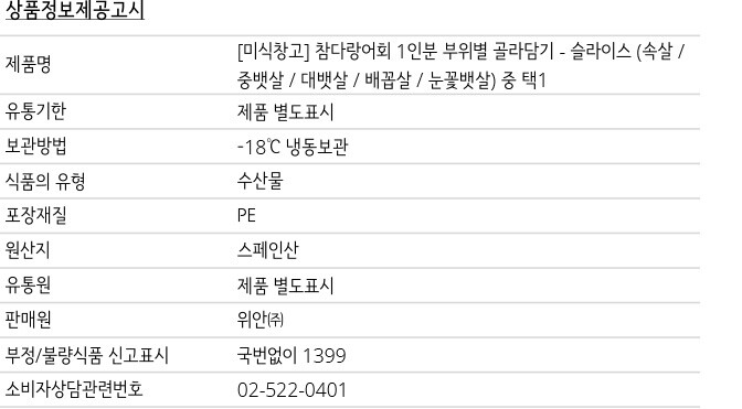 · 참다랑어회(참치회)는 급냉시킨 제품으로 수령 후 즉시 그대로 냉동보관 하시고 가급적 당일 섭취 또는 3일 이내에 섭취 바랍니다. 드시기 전에 냉장실에서 2~3시간 저온숙성 해동한 후 드시는 것을 권장해드립니다.
