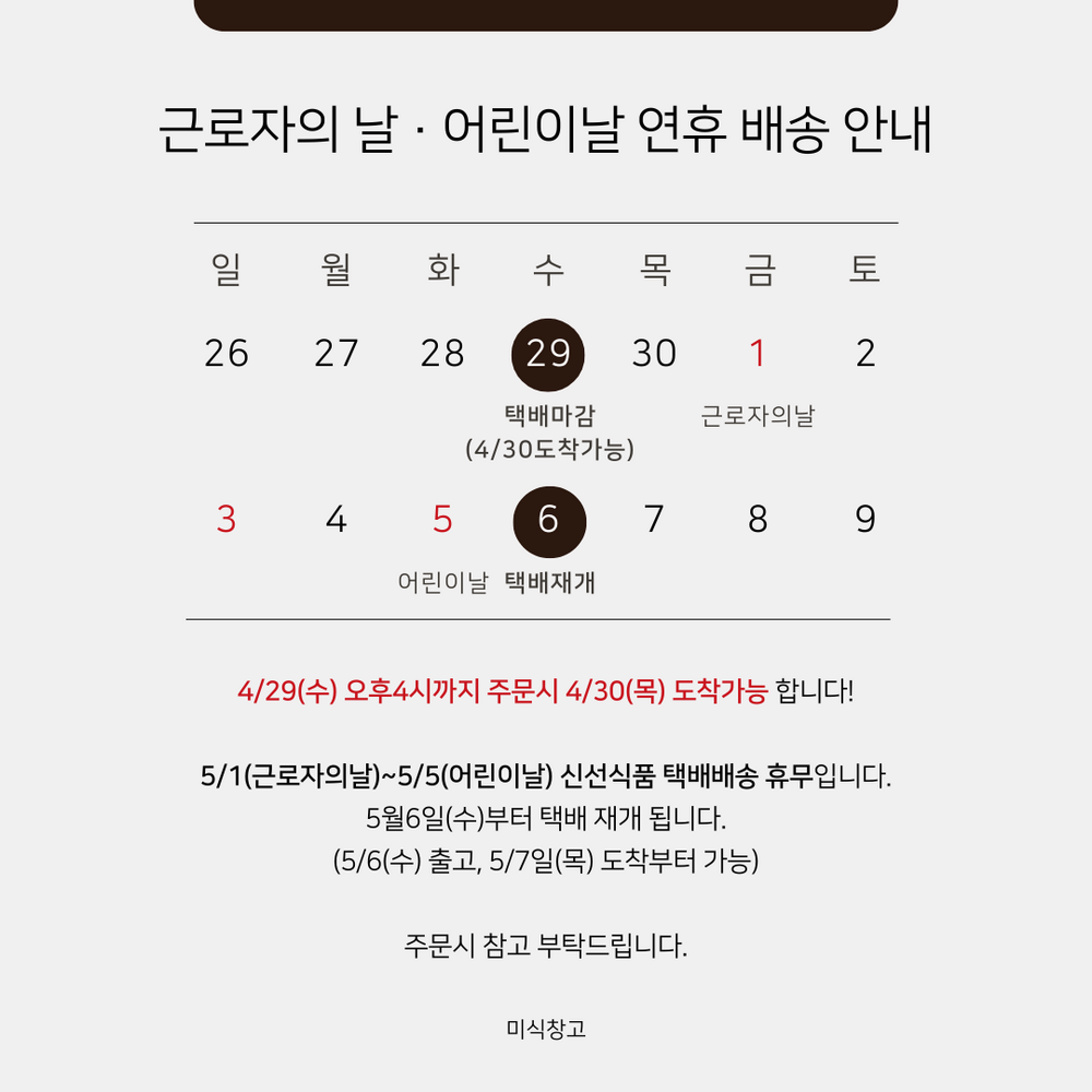 - 도착가능일자 : 화~토 도착가능 (일요일/공휴일 휴무) ※ 공휴일 및 토/일요일은 식품택배 출고 불가 ※ 월~금 출고 가능 → 화~토 도착 가능