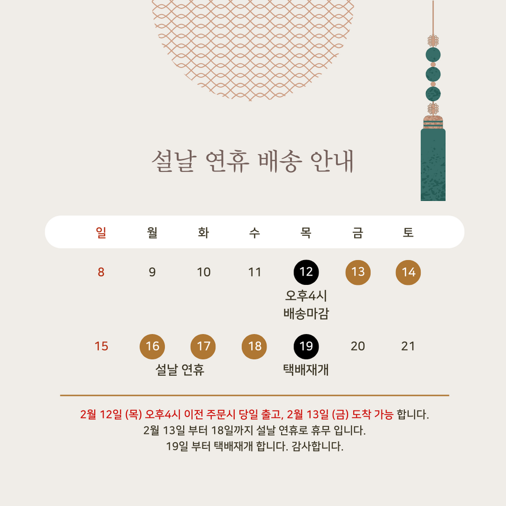 - 도착희망날짜에 도착하도록 하루 전날 발송해드리나, 일반택배 도착시간은 지역 택배사 지점마다 상이할 수 있습니다. (택배기사님들 동선은 거의 일정한 편으로 평소 로젠택배를 수령하셨던 시간대일 확률이 높습니다)