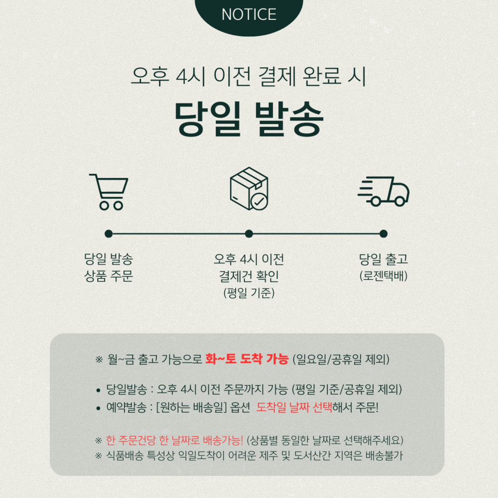 - 주문마감시간 : 16시까지 (주문시 당일발송 다음날 도착가능) ※ 평일(월~금) 16시이전 주문시 당일발송 / 금16시이후 및 주말(토~일) 주문건은 주말이 지나고 월 발송