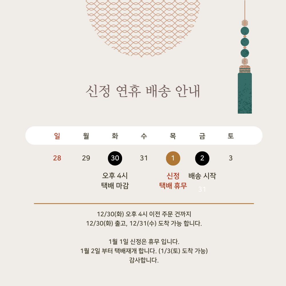 - 택배배송은 출고 후 익일(다음날) 이내 도착한 경우 정상배송된 것으로, 배송도착시간으로 인한 반품 및 가격 보상은 불가합니다.
